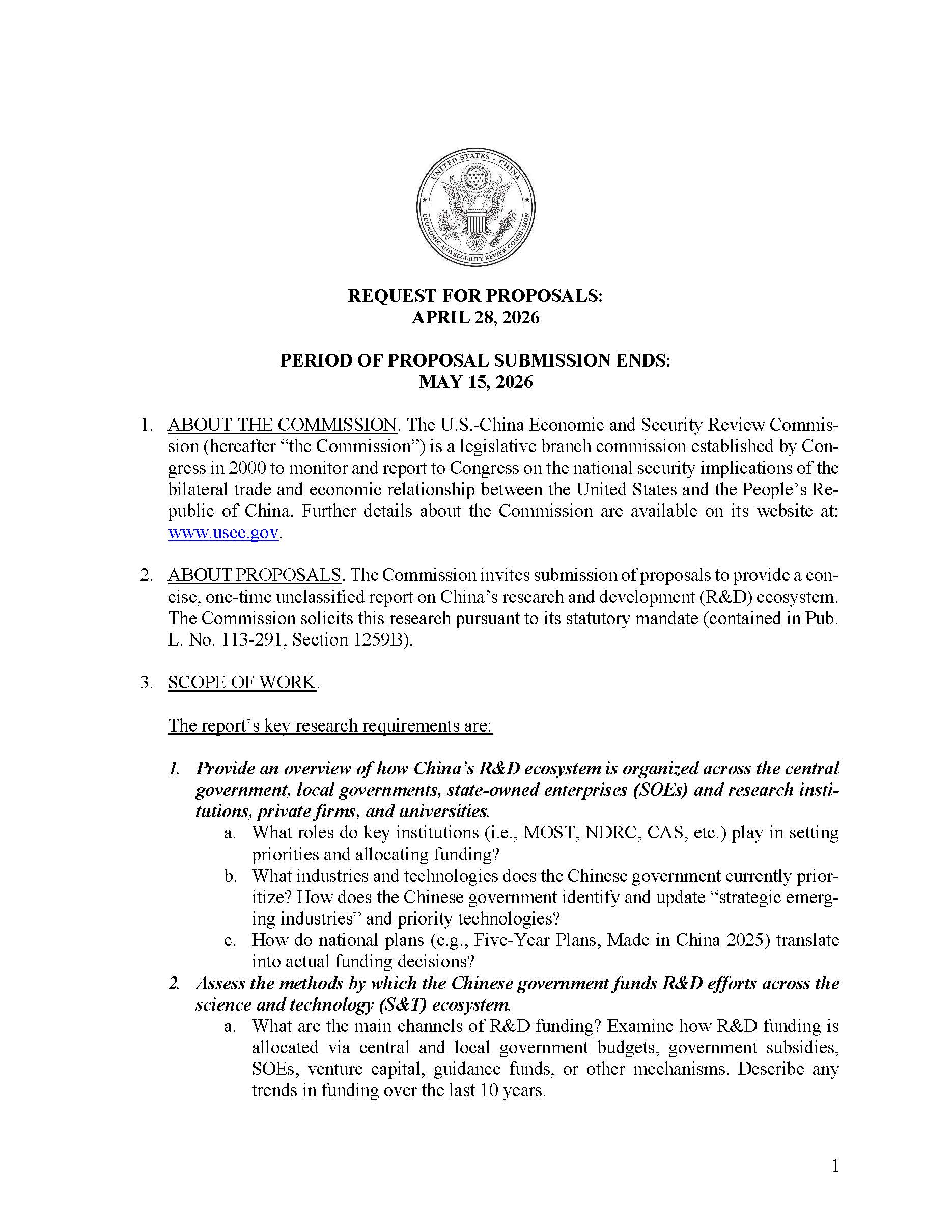 The U.S.-China Economic and Security Review Commission invites submission of proposals to provide a concise, one-time unclassified report on China’s research and development (R&D) ecosystem, which should: