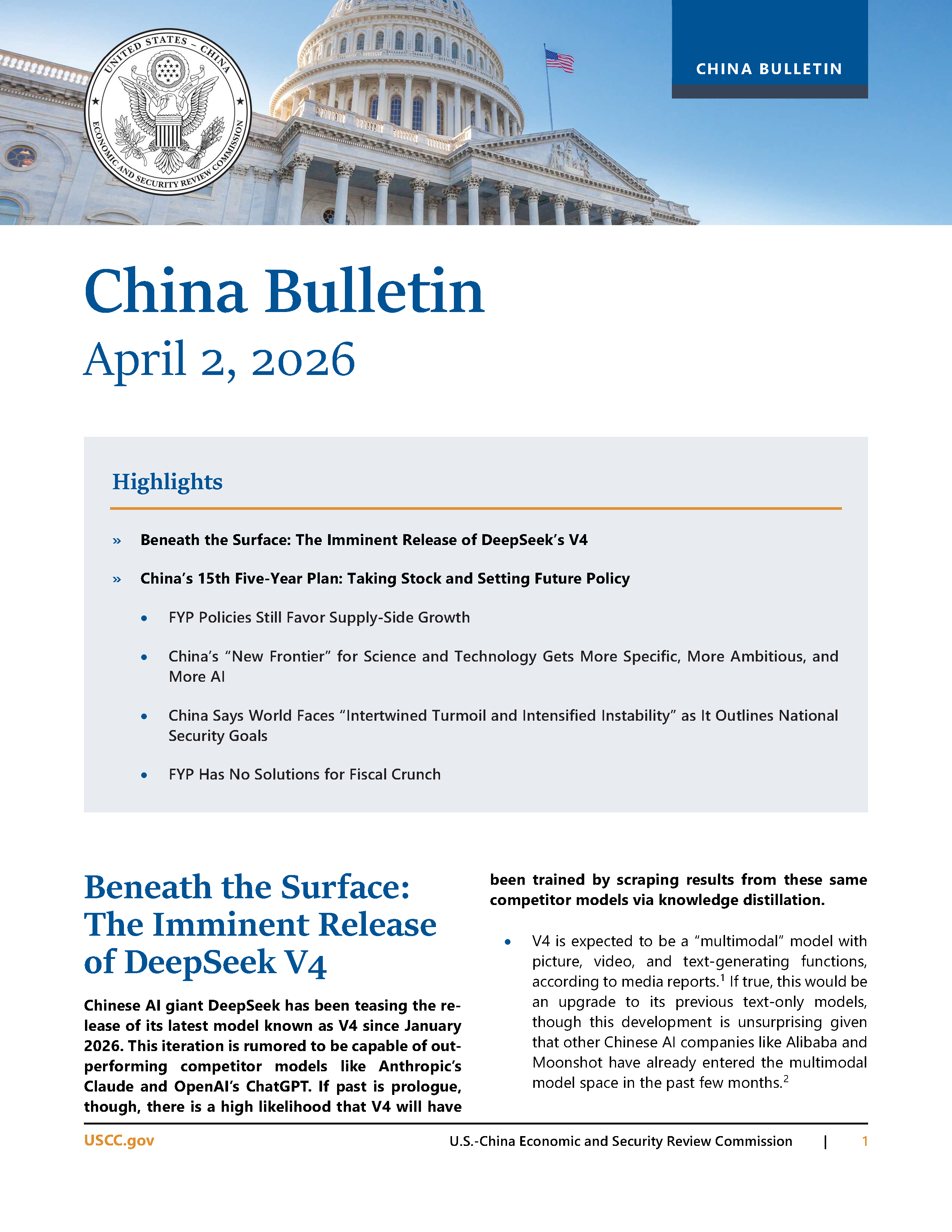 Highlights include: Beneath the Surface: The Imminent Release of DeepSeek’s V4; China’s 15th Five-Year Plan: Taking Stock and Setting Future Policy; FYP Policies Still Favor Supply-Side Growth; China’s “New Frontier” for Science and Technology Gets More Specific, More Ambitious, and More AI; China Says World Faces “Intertwined Turmoil and Intensified Instability” as It Outlines National Security Goals; FYP Has No Solutions for Fiscal Crunch